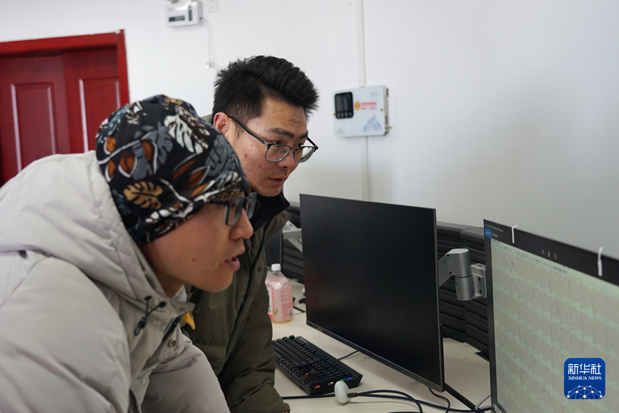 1月29日,AIMS望远镜观测员王城森(右)与同事冯宇飞在工作中交流。新华社记者 陈杰 摄